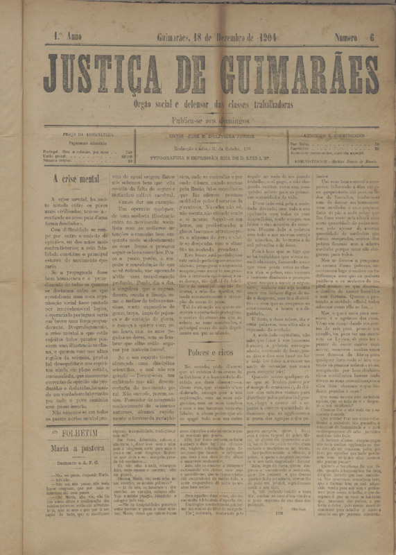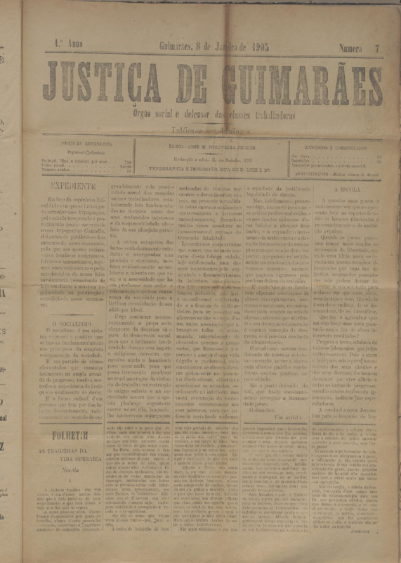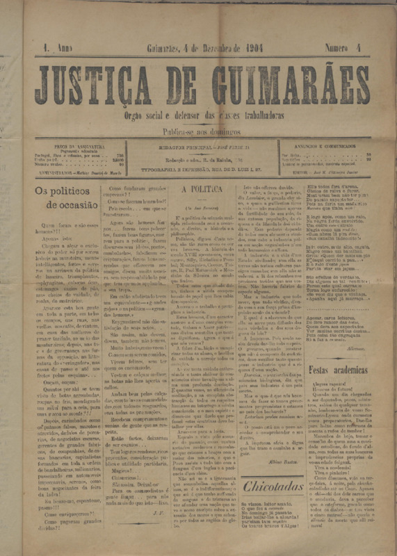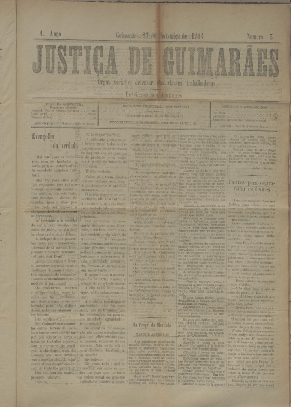 O primeiro número apareceu em 12-2-1872 e terminou com o número 19, em 27 de Agôsto do mesmo ano. Responsável: Ilídio António Dias. Em princípio saía às 2."-feiras. Não diz onde era impresso. Parece que foi de distribuição gratuita. Saíram os Suplementos aos n.° 2, 3 e 5 e um Apenso. Foram seus únicos proprietários os cinco bachareis: Rodrigo Teixeira de Menezes, José da Cunha Sampaio, e João Pereira Leite de Magalhães e Couto e Avelino da Silva Guimarães. Colaboradores : Joaquim Peixoto de Abreu Vieira, Dr. José da Cunha Sampaio, Dr. Avelino da Silva Guimarães, Dr. Martins Sarmento, Dr. Rodrigo Salazar, etc. .. ". Somente se ocupou da anarquia que reinava no firo de Guimarães, em que pontificava o Juiz Sousa Seco. Mais informações