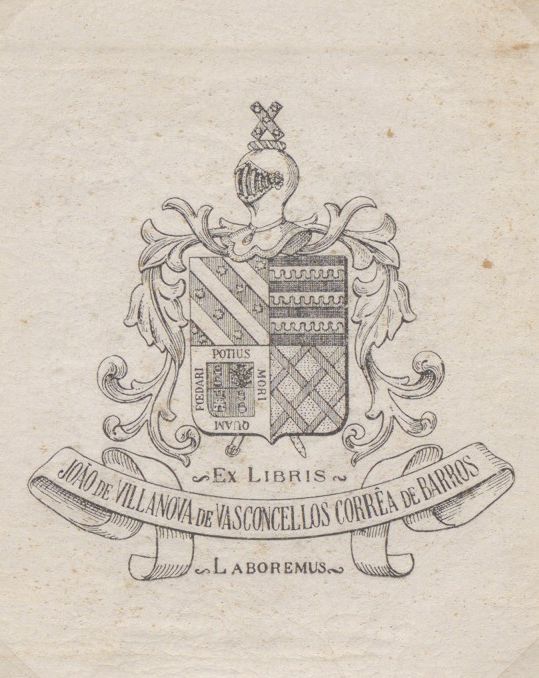 Leitura heráldica: Escudo esquartelado: I-Barros, II- Vasconcelos, III-Vilanova, IV-Correia. Timbre de Barros. Elmo, Virol e Paquife