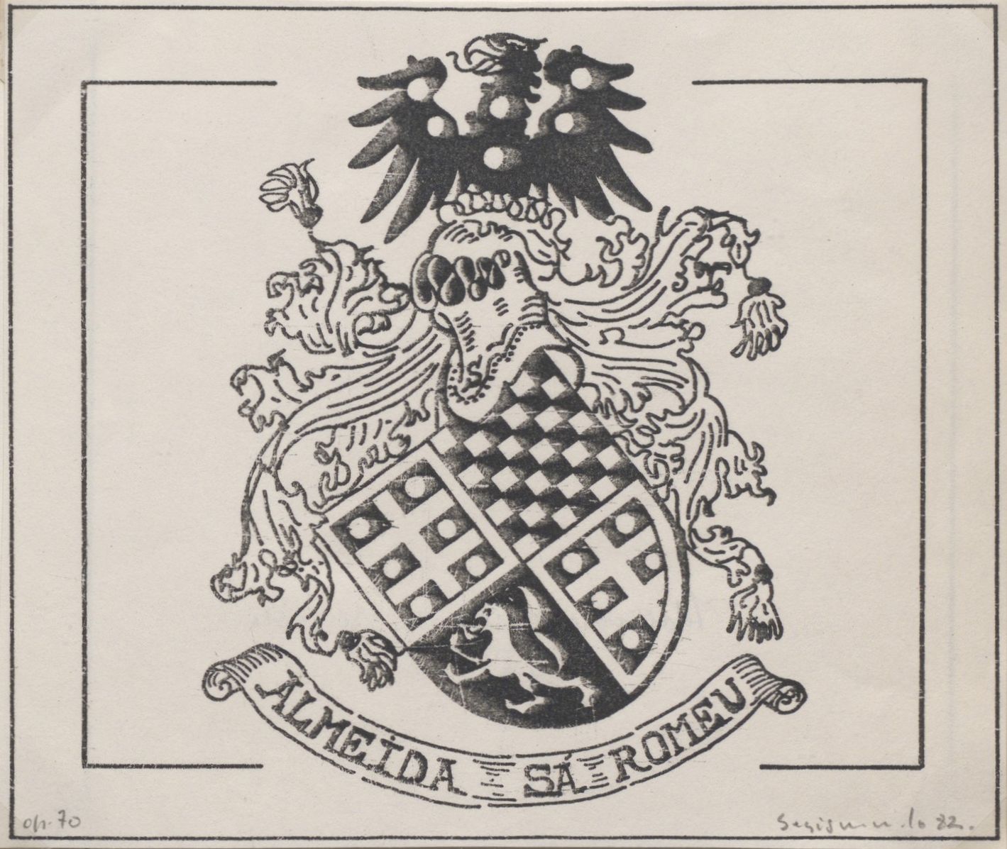 Leitura heráldica: Escudo esquartelado: I e IV- Almeida, II-Sá, III-Castelo-Branco. Coronel de nobreza. Timbre de Almeida. Elmo. Virol. Paquife