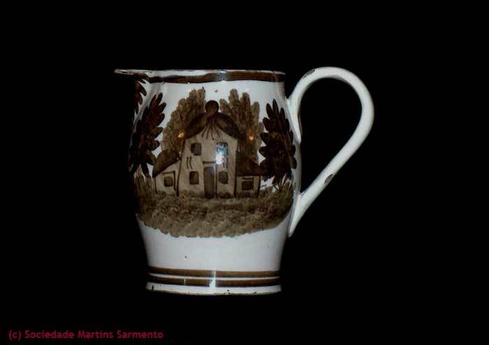 - Caneca com um gargalo largo, debruado com uma risca castanha que finaliza, no bico, com um estampado floral. Bojo decorado, a castanho, com habitação rodeada por motivo naturalista. A base circular é debruada com duas riscas castanhas. Séc. XIX [?].