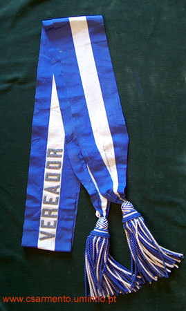Faixa de seda azul e branca com frocos e onde está bordado a seguinte inscrição: vereador.