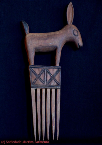 Pente, em madeira, para enfeite do cabelo. Superiormente apresenta uma animal esculpido e decoração incisa. (Cuando-Cubango-Vila Serpa Pinto-Angola, séc. XX).