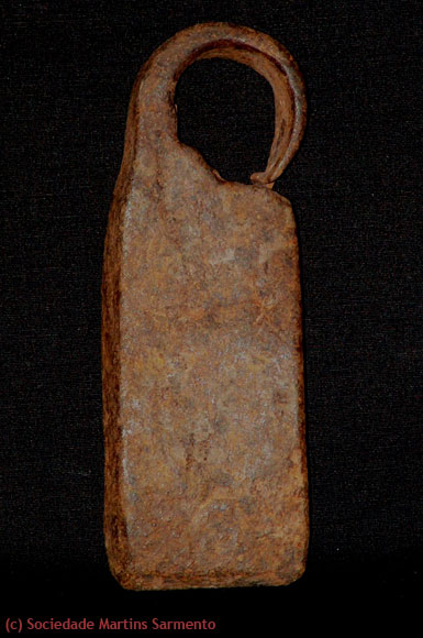 Peso de ferro (0,990 kg), rectangular, empregue na pesagem do linho por fiar. Séc. XIX.