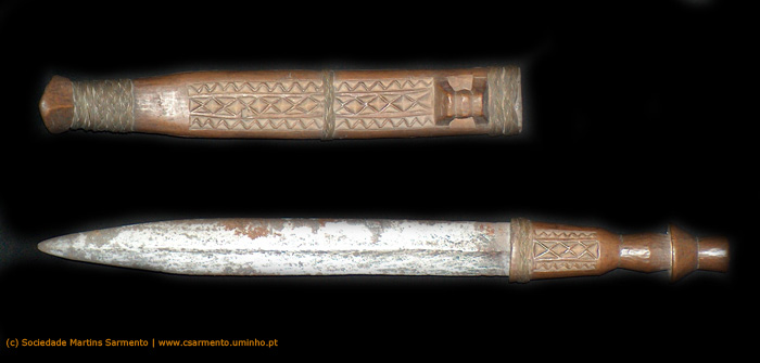 - Punhal com cabo de madeira decorado com incisões e com uma barra de fios em cobre entrançados. A lâmina é de metal e a bainha de madeira, é decorada com incisões e fios de cobre entrançados formando oito barras: cinco inferiormente, uma ao meio e duas superiormente. (Séc. XIX/XX).