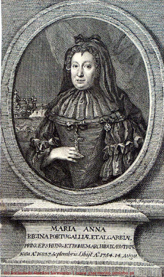 MARIA ANNA/ REGINA PORTUGALLIAE ET ALGARBIAE/ PRINCEP SHUNG. ET BOHEM. ARCHIDUX AUSTRIAE/ Nata A.º 1683. 7. Septembris. Obyt A.º 1754. 14 Augu.