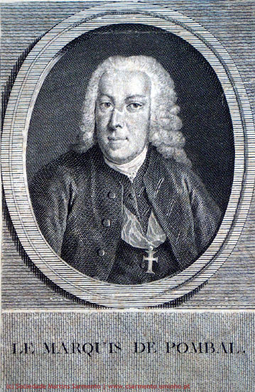 Retrato, do busto, do Marquês de Pombal. Moldura oval inscrita em fundo rectangular. Ostenta ao peito o hábito de Cristo.