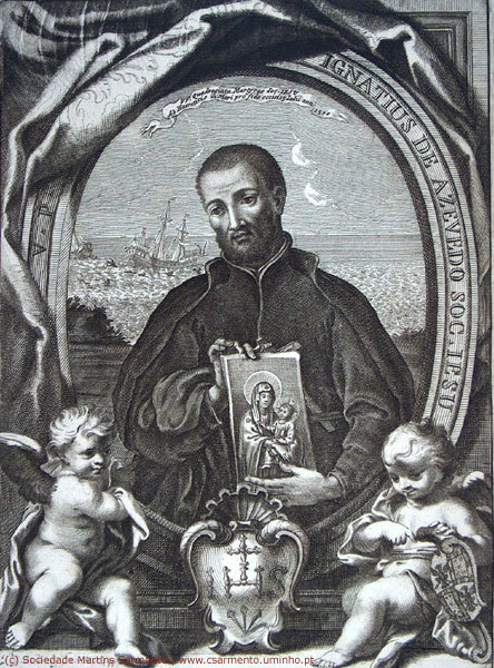 - Imagem, três quartos, de Santo Inácio de Azevedo, segura nas mãos um quadro onde se vê Nossa Senhora e o Menino. Nos cantos inferiores dois Anjos.