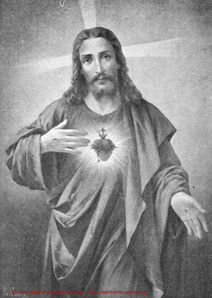 - Imagem, três quartos, de Cristo, onde se destaca o seu coração a sangrar, coroado de espinhos.