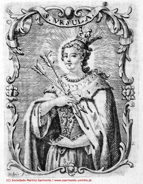 - Imagem, mais de meio corpo, de Santa Úrsula, de manto e coroa, segurando duas setas do martírio.