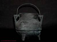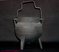 Panela de ferro, com três pés, duas asas e uma pega, usado nas lareiras (...)